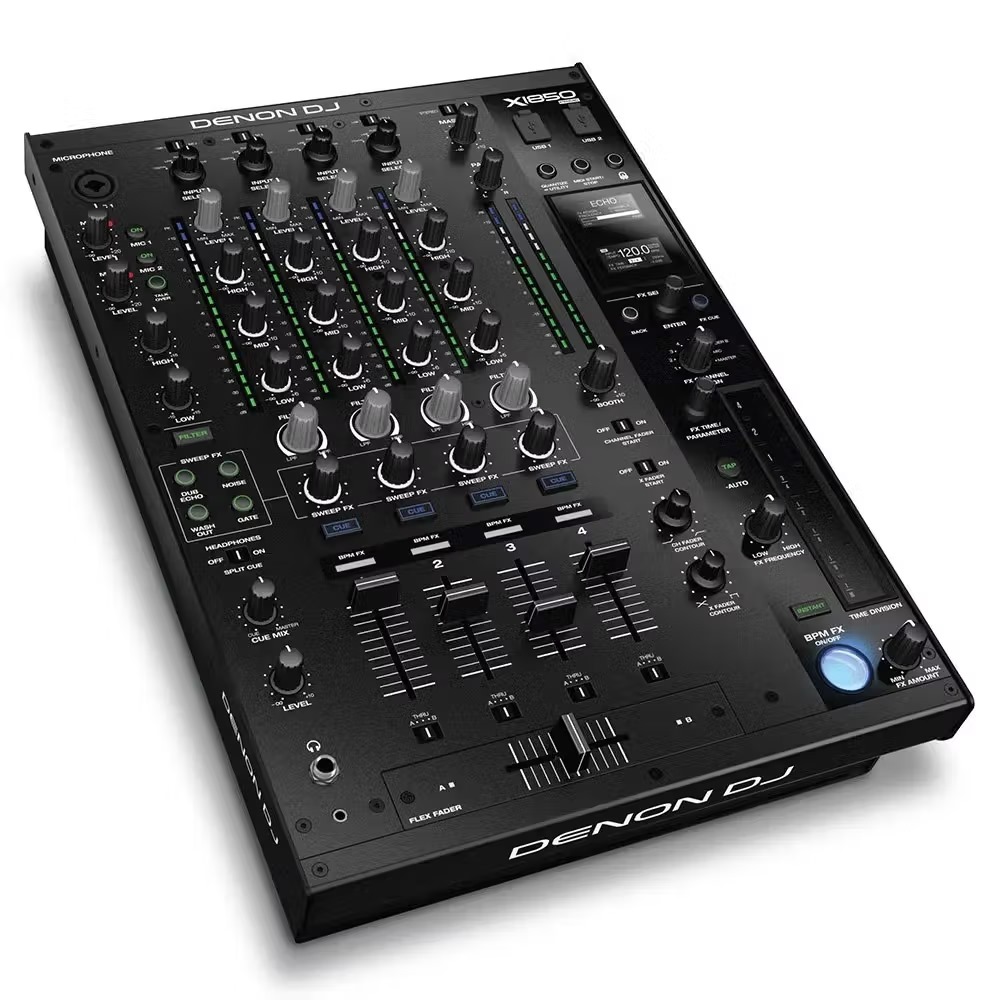 The final piece of the puzzle is Denon’s professional, club ready mixer, the X1850 Prime. With a rugged metal construction, the X1850 is a ‘mixing comfort-zone’ for any DJ. It has 4-channels with multi-assignable inputs, covering every gig performance need. A ‘high-visibility’, 3-band EQ section offers both ‘normal’ and expressive ‘isolation’ modes. Smooth line and crossfader control handles all Pro-DJ mixing styles. The crisp OLED screen allows you to customize X1850 DJ workflow and performance settings plus access, adjust and edit 16 expressive Pro Club FX. Plus no need to sacrifice line faders with 2 independent, EQ/level controlled microphone channels with ‘talkover’ and Split/Cue headphone monitoring with 1/4″ jack plus minijack inputs.