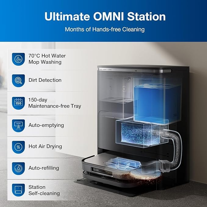 • 【Upgraded All-in-One OMNI Station】 The all-in-one OMNI station supports 70℃ hot-water mop washing, self-emptying, auto water refilling and hot-air drying. This multi-functional station prepares your DEEBOT X5 PRO OMNI for any cleaning challenge, embodying the essence of convenience and readiness.