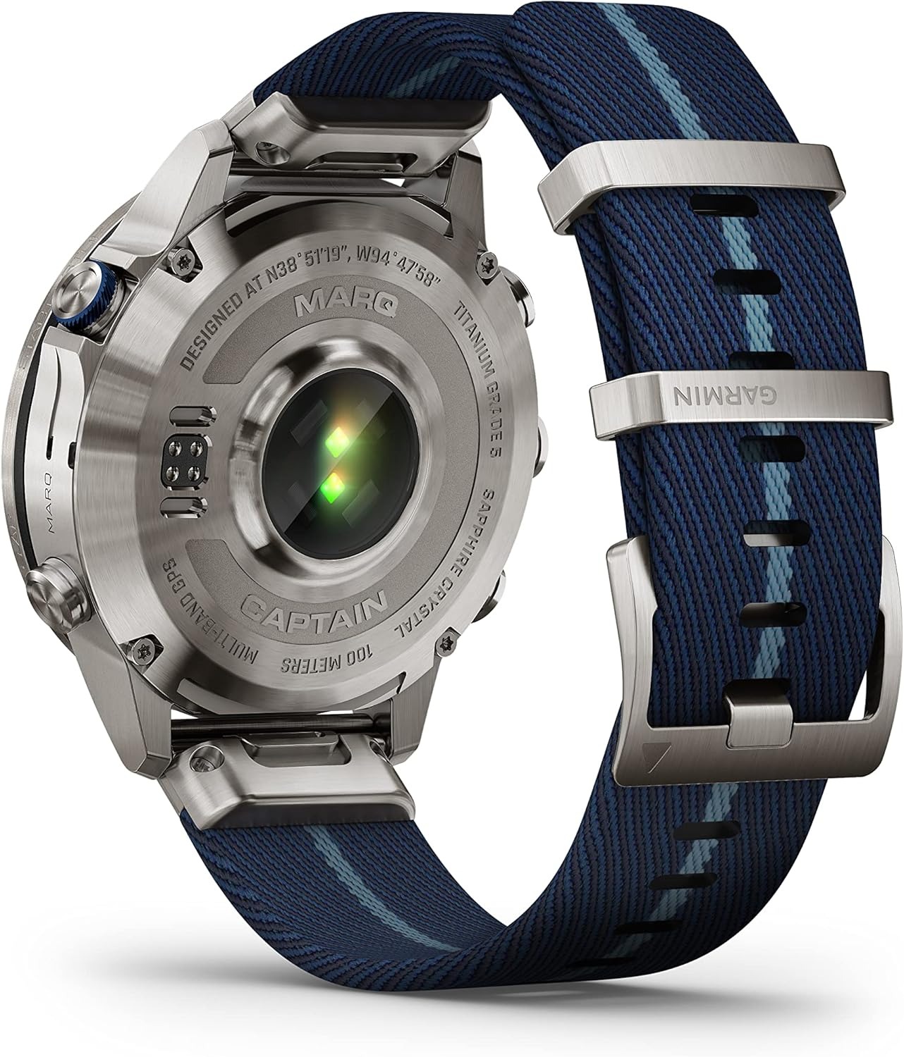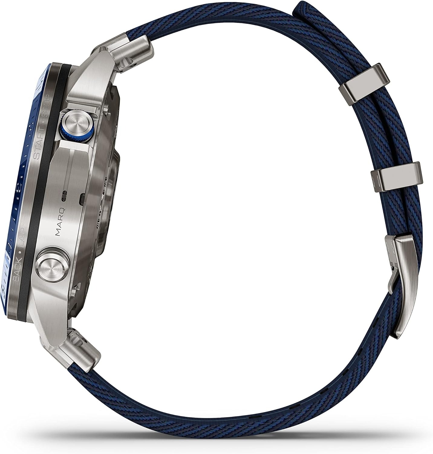 Built for living life at the helm, this luxury modern tool watch features a race-inspired striped jacquard-weave nylon strap and a stunning AMOLED touchscreen display with traditional button controls. The 46 mm case is made of Grade-5 titanium for an ultradurable design.