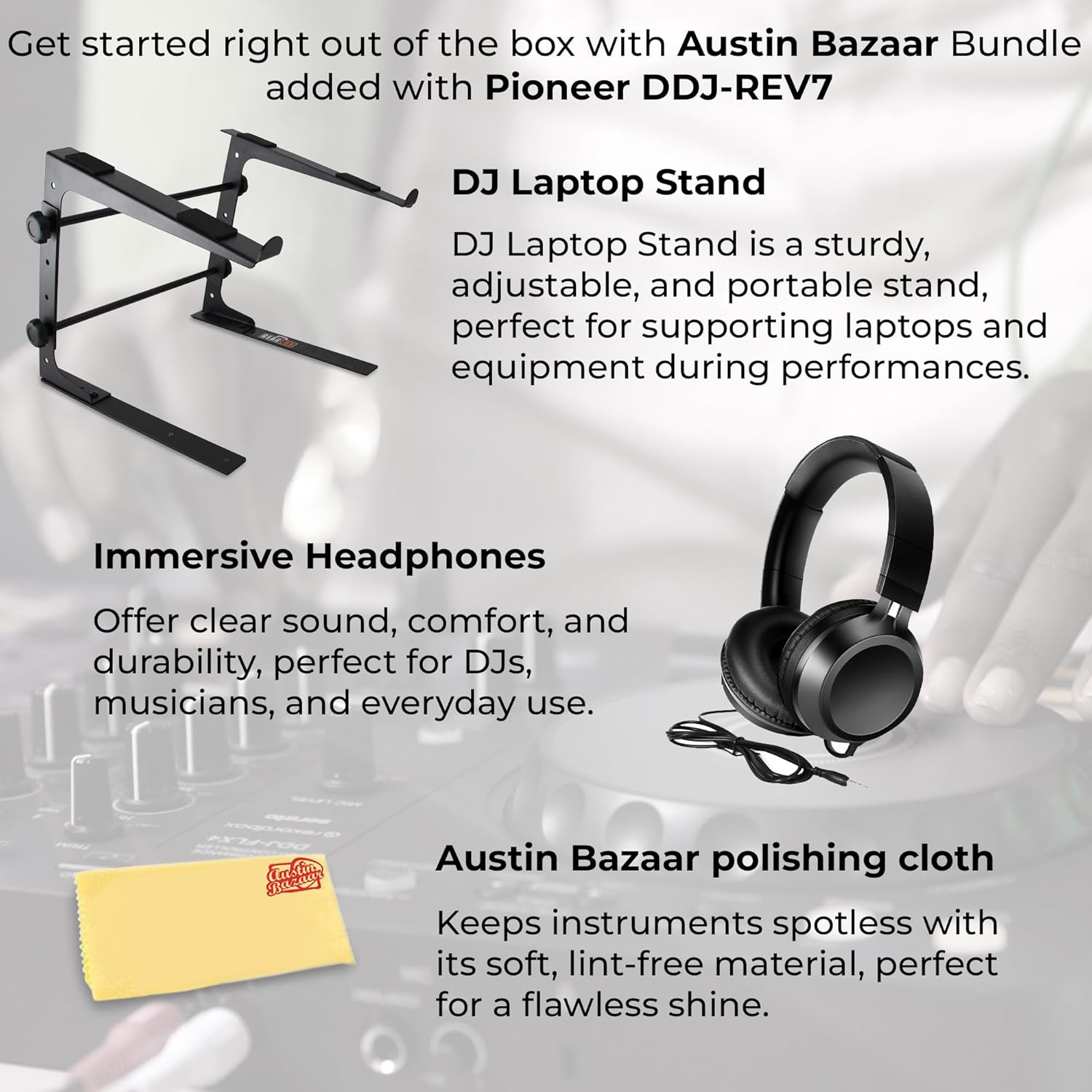 The DDJ-REV7 is built to get the most from the Serato DJ Pro performance software and boasts a brand-new design. The layout of this 2-channel unit emulates a professional DJM-S mixer + PLX turntable setup, and includes specialized features for open-format and scratch DJs. The DDJ-REV7 is solid and robust, yet lightweight enough to grab by the handles on the chassis and carry to your next gig. Contrasting matte and hairline finishing in different sections of the aluminum top plate create distinction between the deck and mixer sections, so the layout looks like a traditional 2 x turntable + mixer setup, while the On Jog Displays mimic the label in the center of a vinyl record. Switch on Silent Cue and avoid the sound of the music speeding up as the platter starts to spin. Simply choose a Hot Cue, then hit play on the deck and it will sound the same as hitting a cue point on a DJ player. Assign the Smooth Echo effect to your choice from a selection of controls, e.g. a fader or pad. Then, when you turn on Smooth Echo with its dedicated button, the echo will be triggered as soon as you move the relevant control. As soon as you’ve downloaded Serato DJ Pro to your PC/Mac, you can simply connect the DDJ-REV7 via the supplied USB cable and start DJing. A voucher for the Serato Pitch ‘n Time DJ Expansion Pack is included, which enables key shifting and key syncing with perfect audio quality. With a digital-to-analog converter from ESS Technologies and improvements to the audio design, the DDJ-REV7 achieves the highest sound quality of any Pioneer DJ controller. At Austin Bazaar we bundle your instrument with necessary accessories saving you time and money. The included adjustable laptop stand fits up to 17″ wide laptops and is great for DJs, musicians, producers with limited space on their desks or work stations. A pair of headphones are included for no disturbance. An Austin Bazaar polishing cloth is included so you can keep your instrument in mint condition.